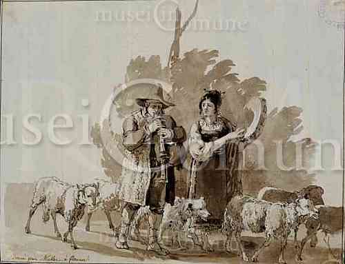 Pastore con zampogna e gregge e contadina con tamburello