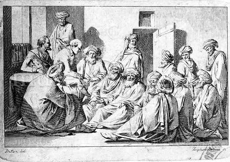 Due occidentali con un gruppo di anziani arabi