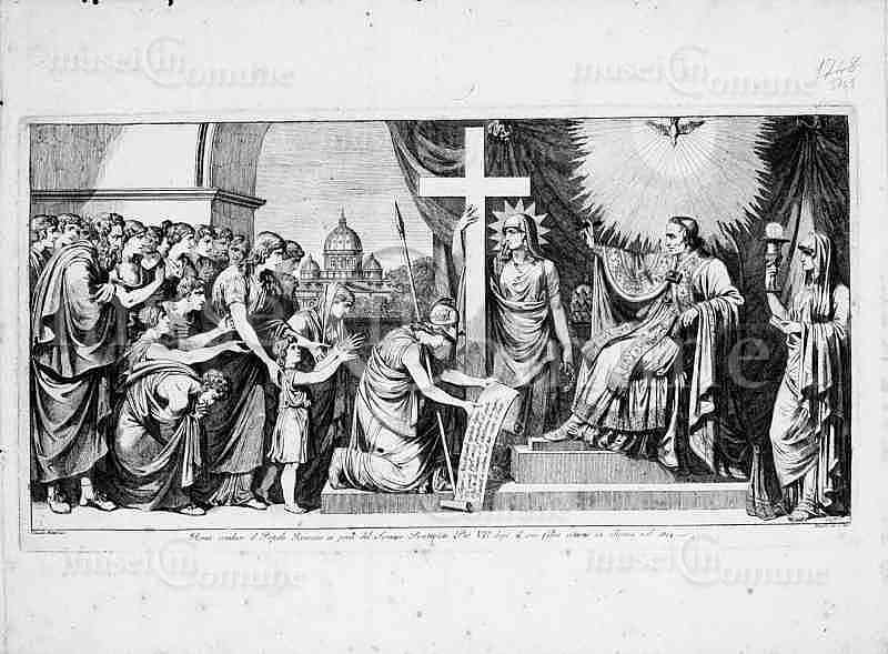 , allegoria del ritorno a roma di pio vii la dea roma riconduce il popolo al pontefice