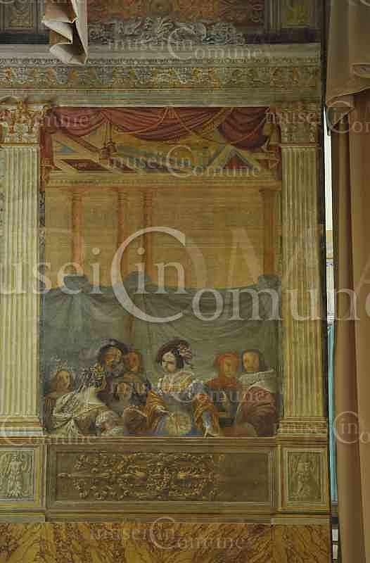 ID foto: 6605 Soggetto: Teatro di Villa Torlonia, Parete est del Palcoscenico (finti palchi con spettatori e tendaggi)